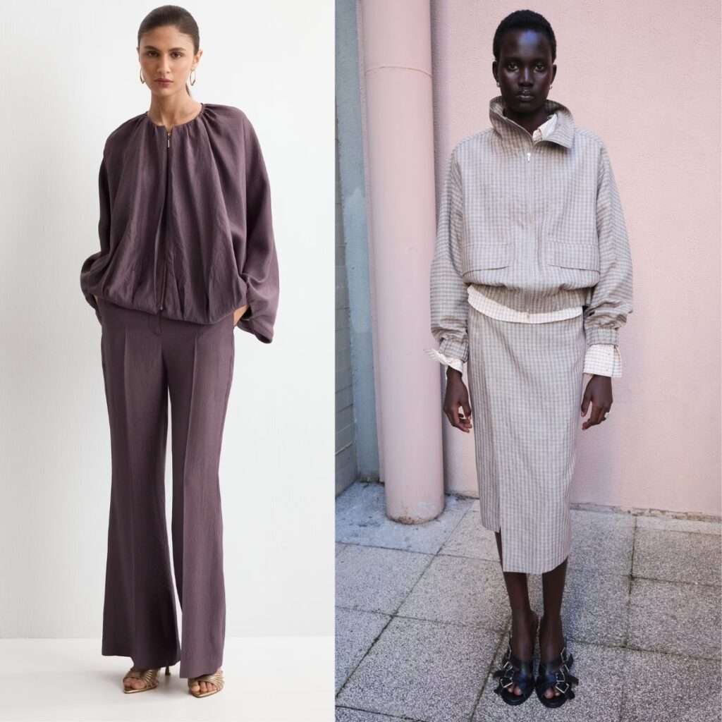 This season, the new bomber jacket comes in softer, more fluid fabrics, creating volume and movement at the same time. It is still sporty, but less “college campus” and more “fashion editor running between meetings in Milan”.