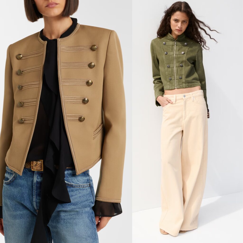 This spring version is short, structured, and decorated with braid trims and metal buttons. Wear yours with a mini skirt, a voluminous skirt, tailored trousers, or jeans. Depending on the styling, it can go from polished chic to grunge princess in two accessories.